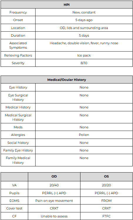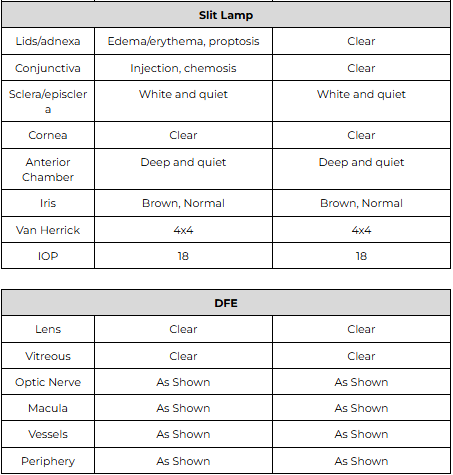 Educated patient on today’s findings. Referred to PCP or ER STAT for initiation of intravenous antibiotic therapy for orbital cellulitis. Return to clinic in 1 day after discharge from the ER to monitor visual acuity, red desaturation, extraocular motility, proptosis, intraocular pressure, corneal integrity, and optic nerve function. Consider systemic oral antibiotic (e.g., Augmentin 250–500 mg PO TID, Cefaclor 250–500 mg PO TID, or Bactrim DS PO BID for penicillin allergy) following improvement with IV therapy.