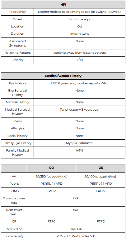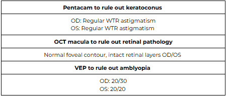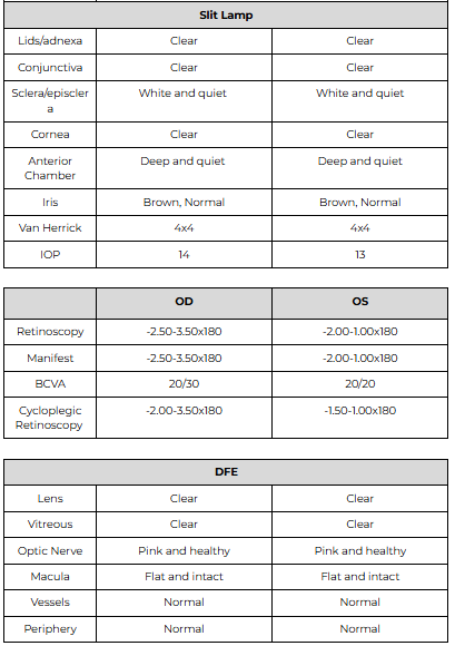 Patient and parents educated on the diagnosis of amblyopia, which is reduced vision in one or both eyes due to abnormal visual development, often caused by strabismus, refractive error, or visual deprivation. In this patient's case, the amblyopic eye is a result of an asymmetric refractive error between the two eyes. Prognosis is good with full time spec wear, but additional treatment such as patching or atropine treatment may be required if spectacles do not work. Full time spectacle wear is crucial for proper binocular vision development. RTC immediately if symptoms such as eye turn, double vision and headaches occur.